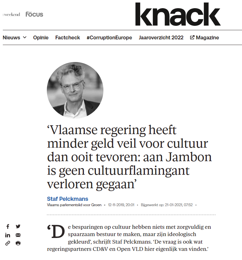Rechts: opiniestuk op Knack.be voor Vlaams Parlementslid Staf Pelckmans over besparingen in de cultuursector.